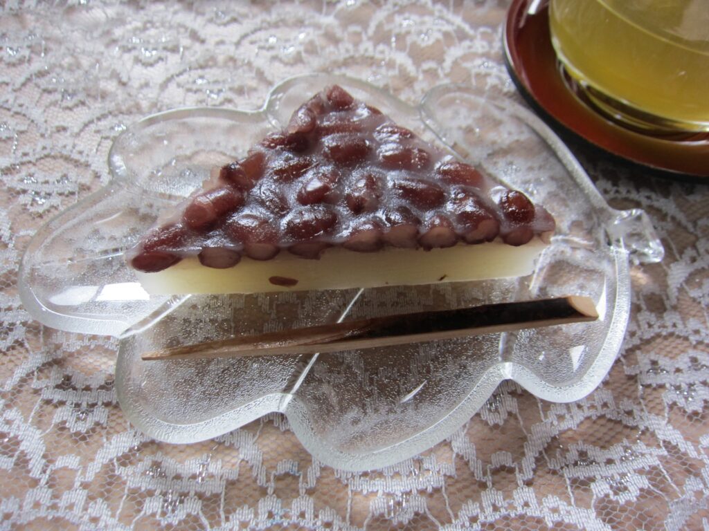 薄力粉に上新粉と本葛粉を少しづつ入れた、ういろうの生地に、その上に甘納豆(小豆)をのせて蒸し器で蒸しあげました。