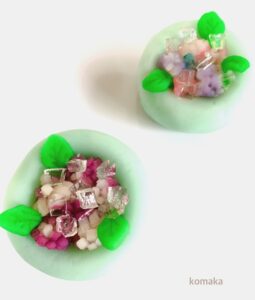 白い練り切り餡に中餡を丸めて、真ん中をくぼませ、緑色に色付けした練り切り餡で葉っぱをつくって乗せ、そのあとにピンクとブルーの寒天を細かく切って、中には花の型で抜いて花柄として乗せ、葉っぱの上には、色付けしていない寒天で小さな雨の雫を作って乗せてあります。