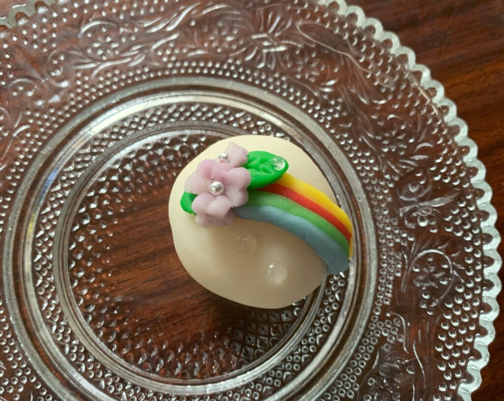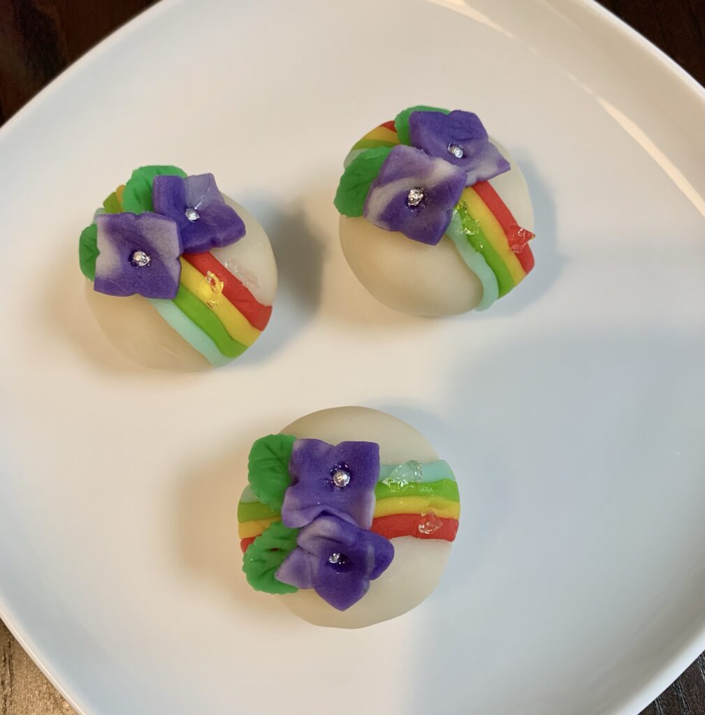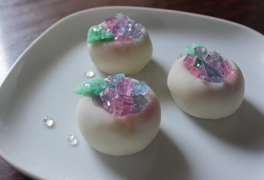 この作り方も、中餡を包餡したあと、真ん中にくぼみをつけて、そこに細かく切った淡いピンクとブルーの寒天を散らばせるだけの簡単にできる方法なので、ぜひ、お試しになってみて下さい😊