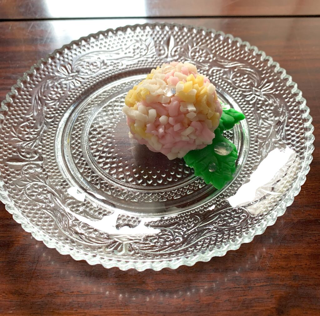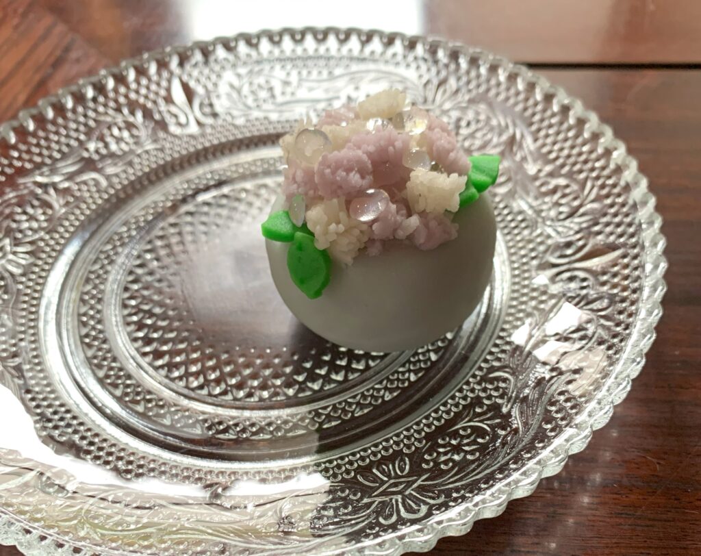 私は当初、一眼レフのカメラの操作方法を学びたくて登録したのですが、そこで和菓子作りもあり、よくインスタの写真で見ていたHIEOMI先生のレッスンもあり、特にこの紫陽花の季節、雨に濡れたキラキラ感が素敵で思わず講習をうけてみました。