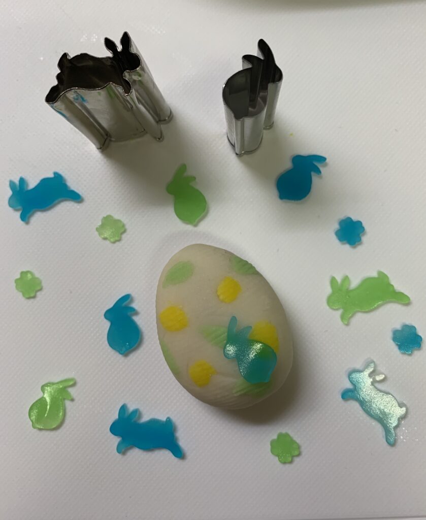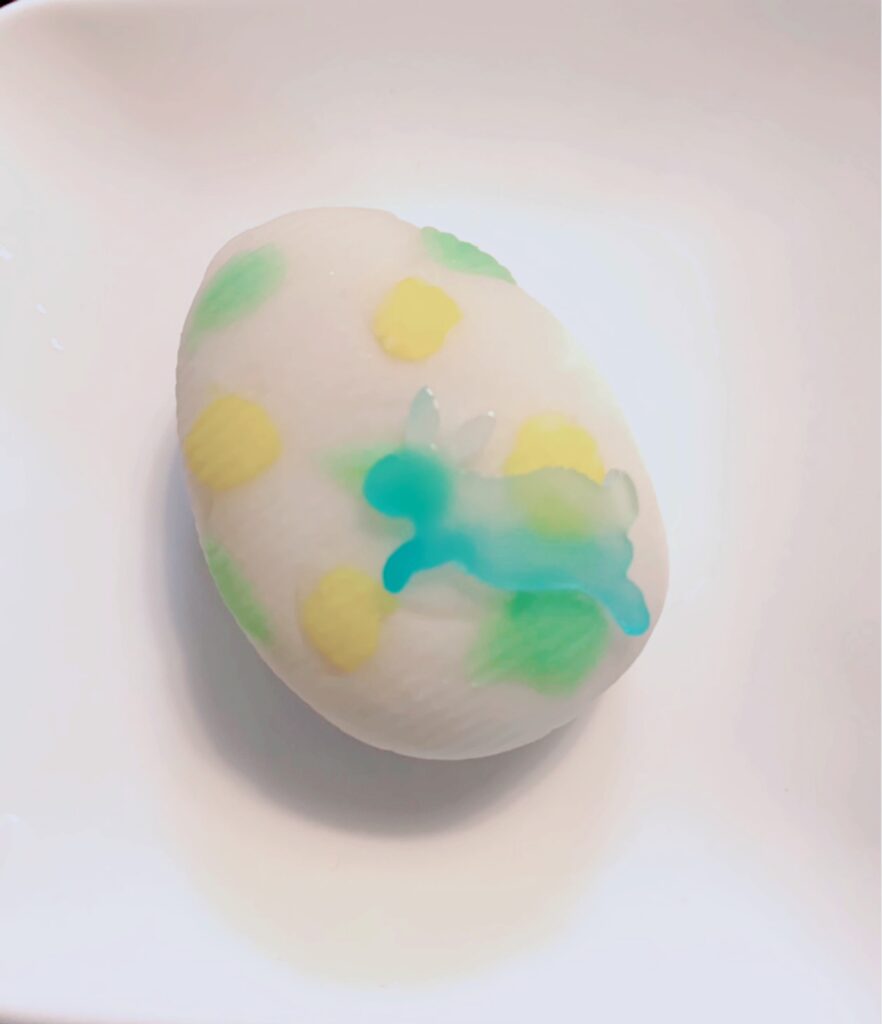 練りきりを卵の形にして、上から小さく、黄色とグリーンに色付けた生地を