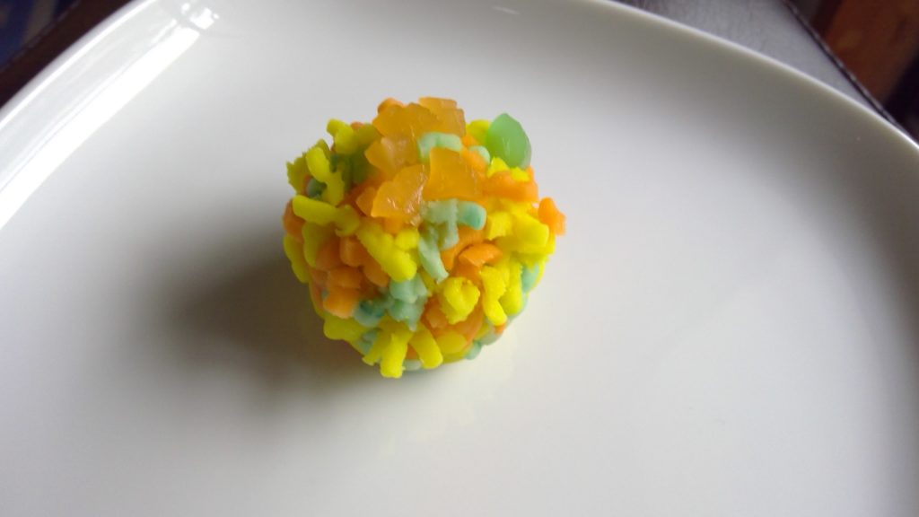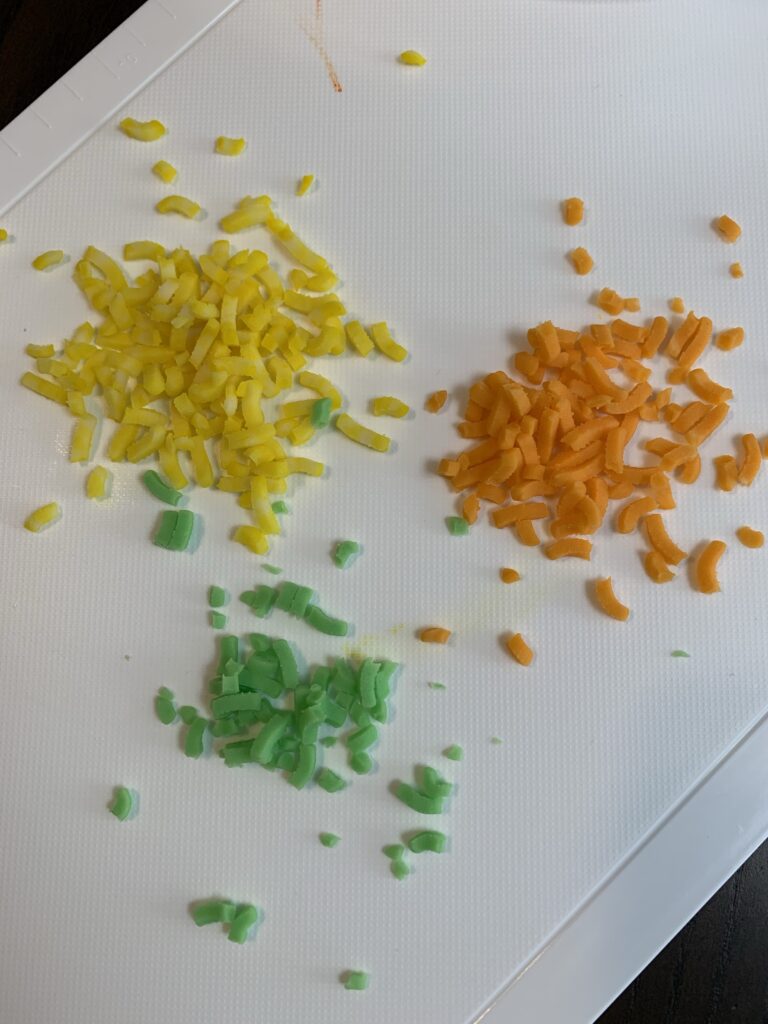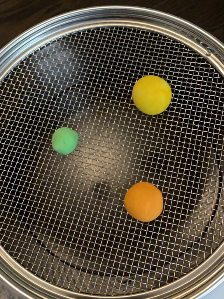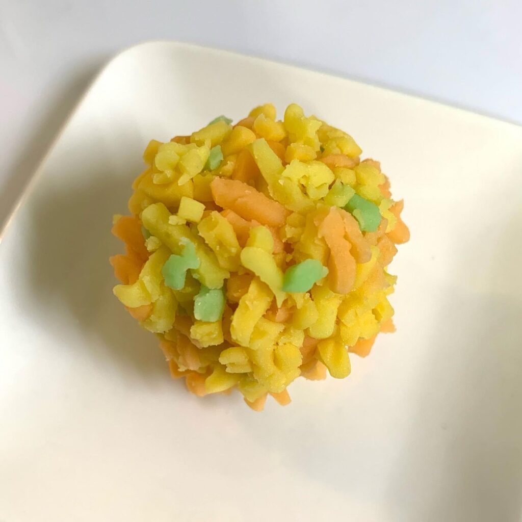 その練り切り餡20gを、黄色10gとオレンジ6g、グリーン4gに分けて丸め、