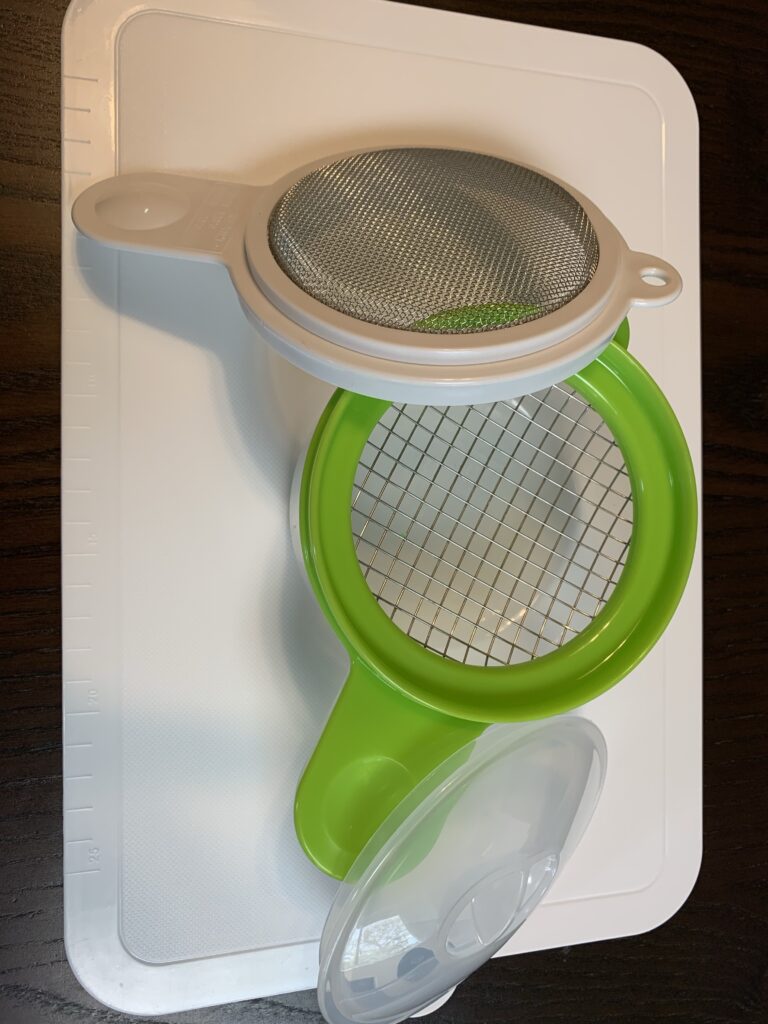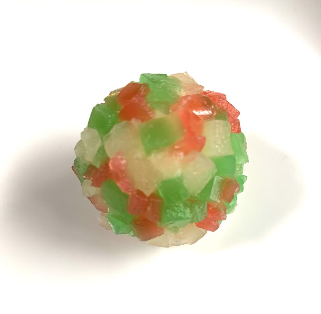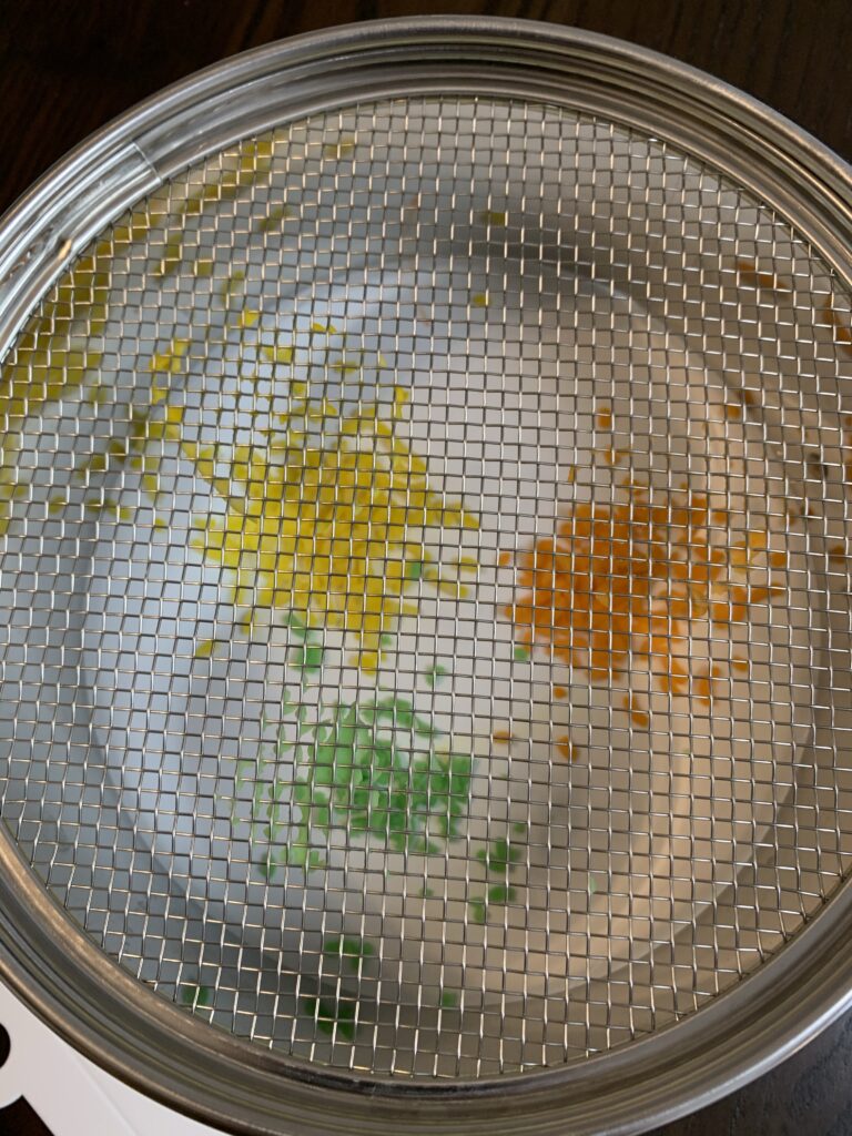 👇の写真は、赤と緑に染色した羊羹を👆の道具の大きめの網で漉したものを、